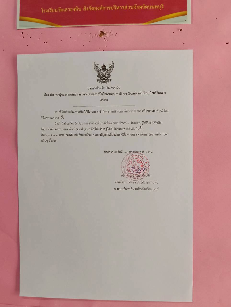 ประกาศผู้ชนะการเสนอราคา จ้างโครงการสร้างโอกาสทางการศึกษา (รับสมัครนักเรียน) โดยวิธีเฉพาะเจาะจง