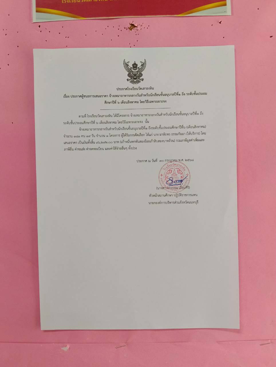 ประกาศผู้ชนะการเสนอราคา จ้างเหมาทำอาหารกลางวันสำหรับนักเรียนชั้นอนุบาลปีที่ 1ถึงชั้นประถมศึษาปีที่ 6 เดือนสิงหาคม