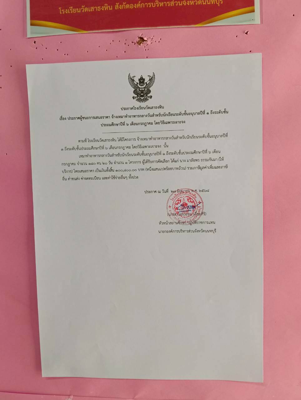 ประกาศผู้ชนะการเสนอราคา จ้างเหมาทำอาหารกลางวันสำหรับนักเรียนชั้นอนุบาลปีที่ 1ถึงชั้นประถมศึษาปีที่ 6 เดือนกรกฎาคม โดยวิธีเฉพาะเจาะจง