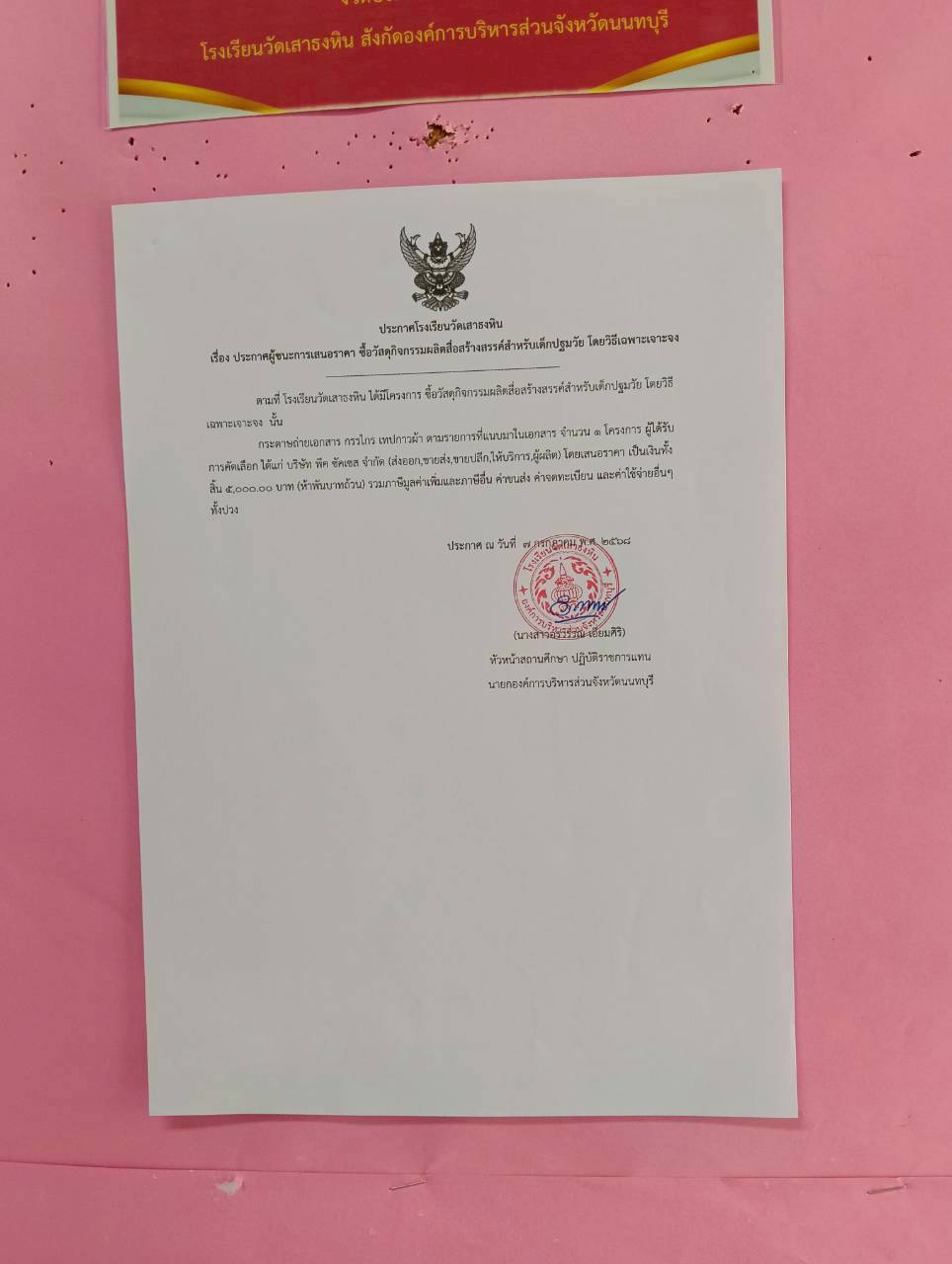 ประกาศผู้ชนะการเสนอราคา ซื้อวัสดุโครงการกิจกรรมผลิตสื่อสร้างสรรค์สำหรับเด็กปฐมวัย โดยวิธีเฉพาะเจาะจง