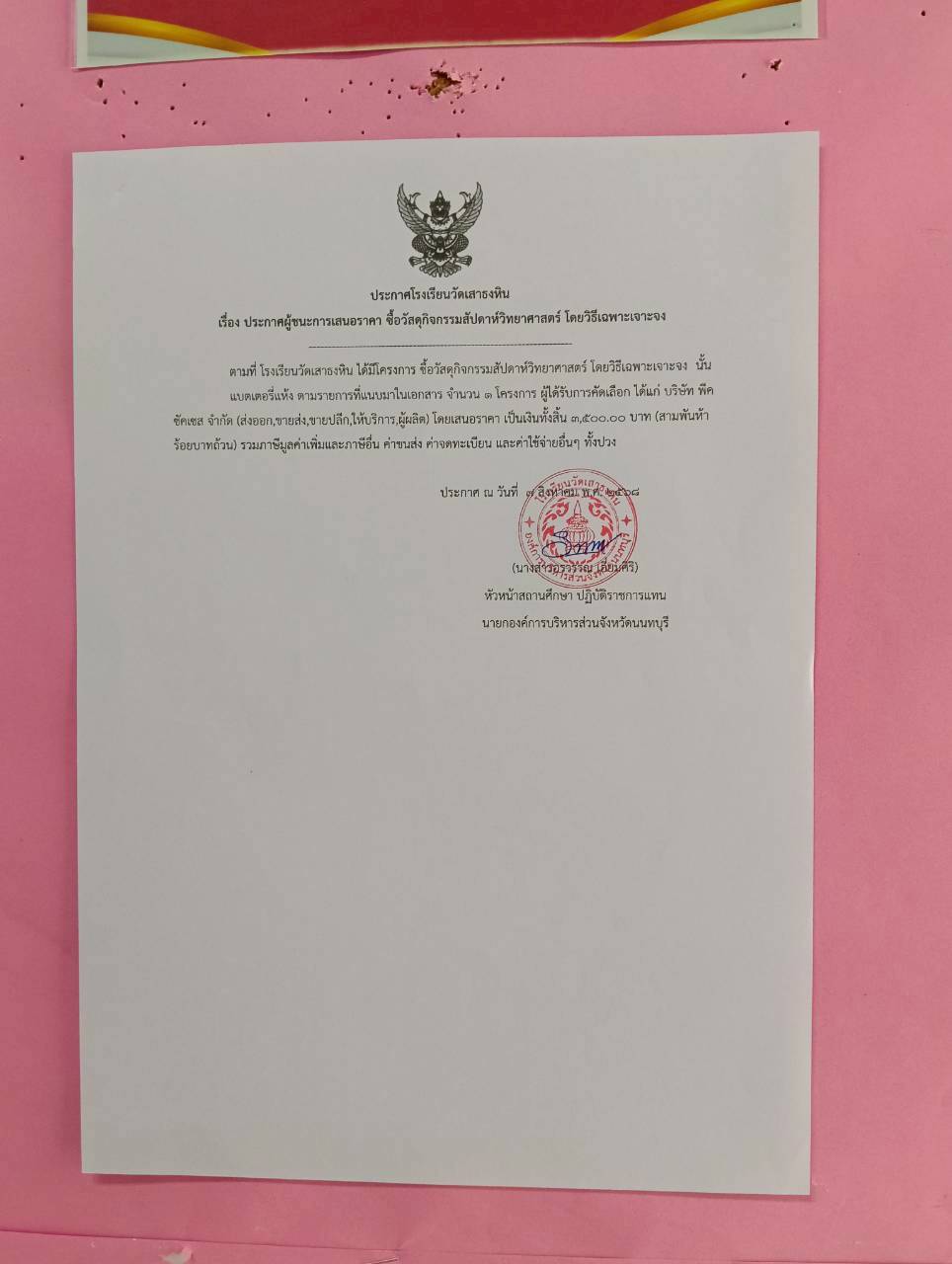 ประกาศผู้ชนะการเสนอราคา ซื้อวัสดุโครงการกิจกรรมสัปดาห์วิทยาศาสตร์ โดยวิธีเฉพาะเจาะจง